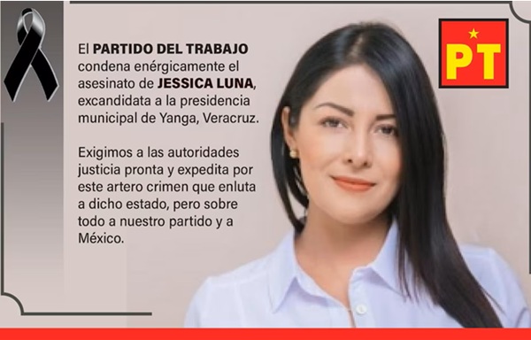 Ciudad de México, 7 Oct-25 (Agencia/VRed).- El pasado lunes 6 de octubre fue asesinada Jessica Flor Luna Aguilera, quien fuera candidata a la alcaldía de Yanga, Veracruz, por parte del Partido del Trabajo (PT), quien se desempeñaba como abogada.