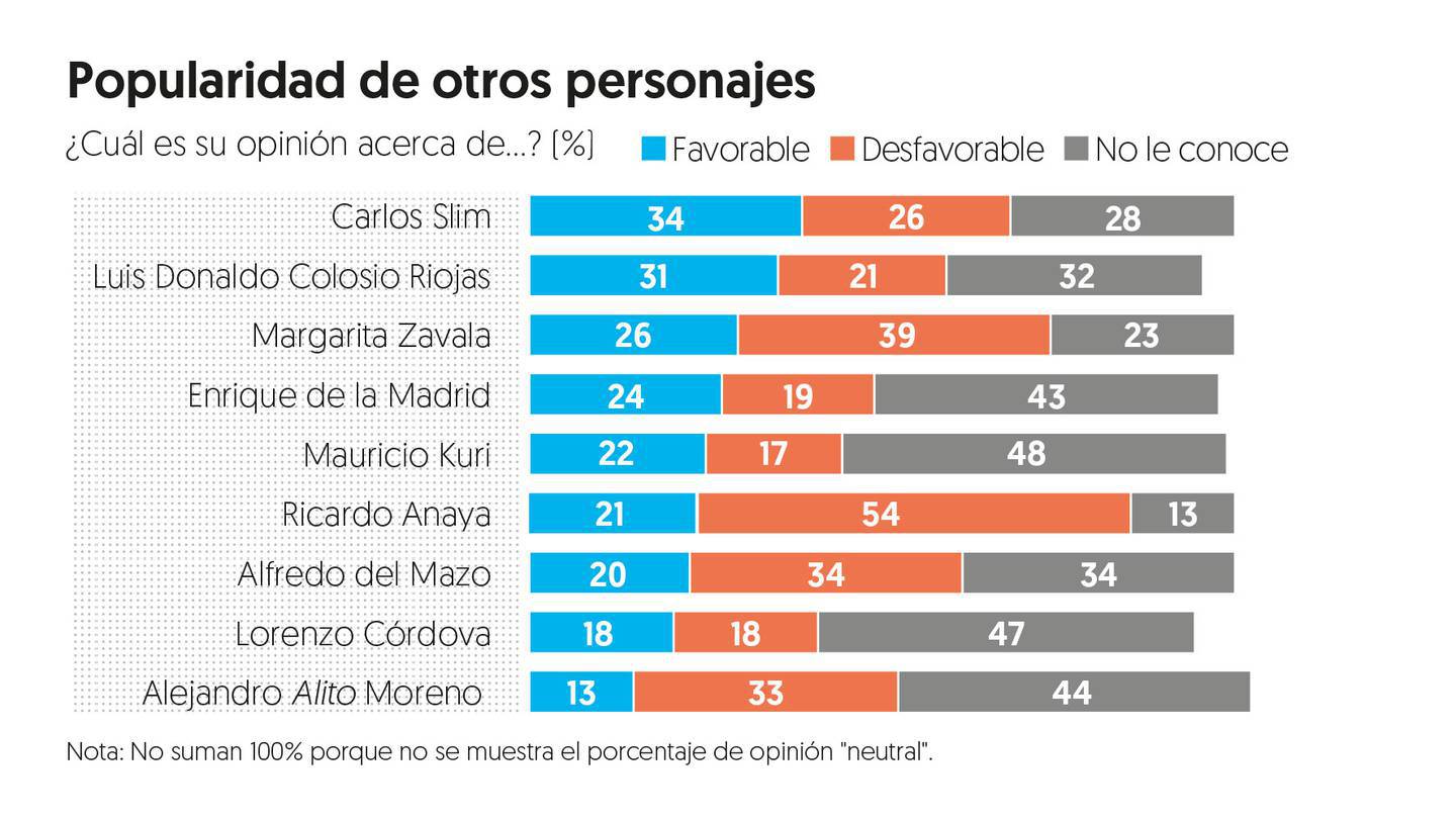 En los resultados finales quien lidera la lista de la oposición es Carlos Slim pero este personaje solo se tomó en cuenta para medir su popularidad entre los consultados. El empresario quien acompañó al presidente en su reciente viaje a Washington obtuvo el 34 por ciento de opinión positiva y el 72 por ciento de reconocimiento.