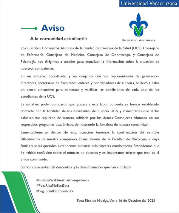 Poza Rica, Ver., 17 Oct-25 (VRed).- Consejeros Alumnos de la Universidad Veracruzana en la región Poza Rica-Tuxpan concluyeron el ejercicio de contactar con los estudiantes matriculados en la Unidad de Ciencias de la Salud (UCS) y lamentan el deceso de Diana Jael Cuervo Santos, única universitaria que habría perecido en la inundación del pasado 10 de octubre.