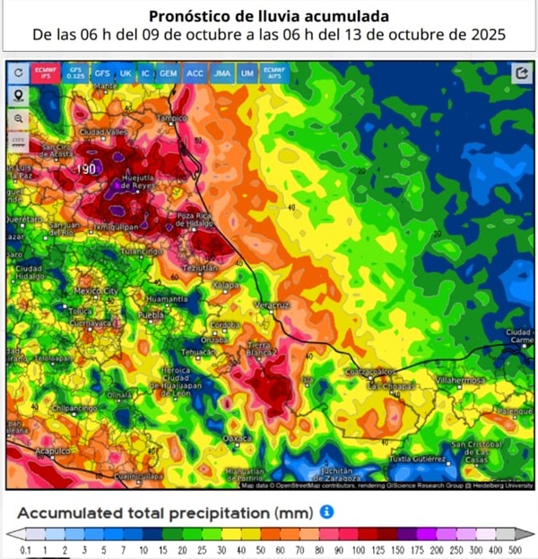 Xalapa, Ver., 9 Oct-25 (VRed).- La Comisión Nacional del Agua (CONAGUA) informó que la persistencia de una vaguada extendida sobre el suroeste del Golfo de México, el ingreso de humedad y los efectos orográficos mantendrán probabilidad de lluvias intensas, desde la cuenca del río Pánuco, hasta el Cazones y en zonas montañosas del Tecolutla, Nautla y Papaloapan.