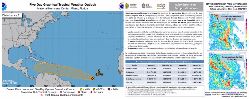 Xalapa, Ver., 29 Jun-21 (VRed).- Informes de la secretaría estatal de Protección Civil (SPC) indican que se emitión un “Aviso Especial” por temporal lluvioso en los próximos siete días en algunas zonas de Veracruz. Se advierte que el disturbio tropical 97L podría evolucionar a ciclón tropical en dos a cinco días.