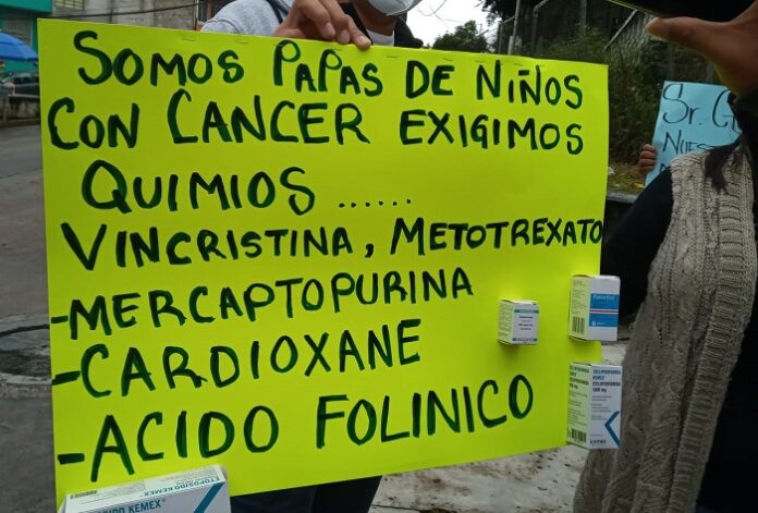 Los manifestantes que portan cartulinas con leyendas como “el cáncer no espera y no respeta edad” y “la salud de nuestros hijos no es un juego”, se suman a la movilización que se realiza a nivel nacional para demandar a la Secretaría de Salud el abasto de medicamentos para niños con cáncer.