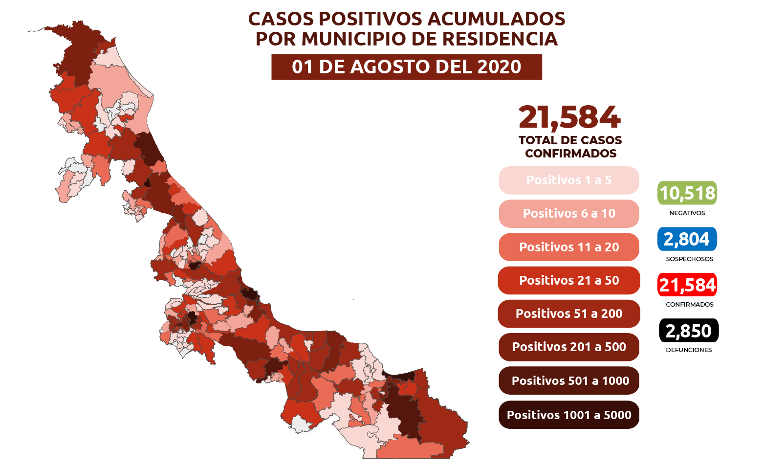 Xalapa, Ver., 1 Ago-20 (VRed).- En seguimiento al panorama del coronavirus (COVID-19), la Secretaría de Salud (SS) informa que, al corte de las 19:00 horas, en la entidad han sido estudiados 34 mil 906 casos, de los cuales, 10 mil 518 resultaron negativos.
