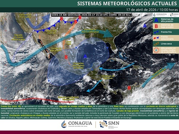 El nuevo frente frío 45 y una vaguada en altura ingresarán a la frontera noreste y norte de México el 17 de abril de 2026.