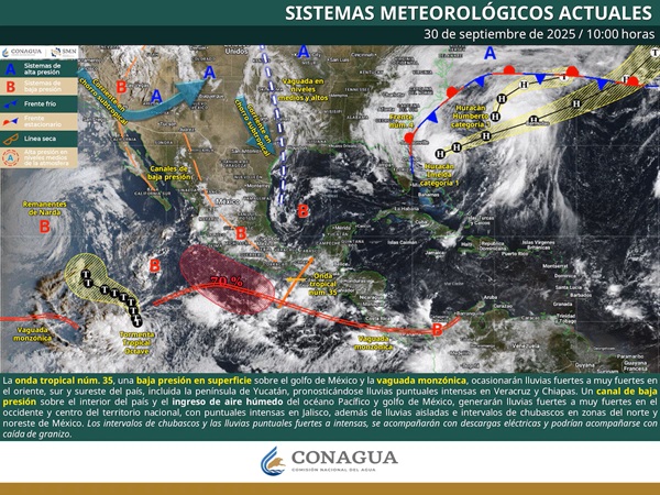 Además, también se prevén lluvias puntuales intensas en Veracruz y Chiapas; muy fuertes en Oaxaca, Tabasco, Campeche, Yucatán y Quintana Roo; fuertes en Puebla y Tlaxcala; así como chubascos en Tamaulipas y San Luis Potosí, debido a la onda tropical número 35.