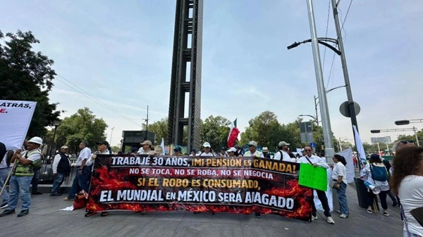 “Trabajé 30 años. ¡Mi pensión es ganada! No se toca, no se roba, no se negocia. Si el robo es consumado, el Mundial en México será apagado”, se lee en una de las mantas que cargan los ex trabajadores procedentes de varios estados del país.