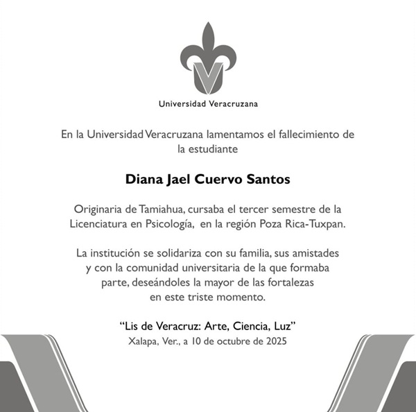 Xalapa, Ver., 11 Oct-25 (VRed).- La Universidad Veracruzana (UV), lamentó el deceso de Daniela Jael Cuervo Santos, estudiante del quinto semestre de la Licenciatura en Psicología, fallecida en la inundación registrada este viernes en Poza Rica.