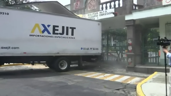 Hombres encapuchados chocaron un vehículo de carga, en reversa, contra una puerta de la unidad militar y luego le prendieron fuego hasta reducirlo a cenizas, según imágenes de televisoras.