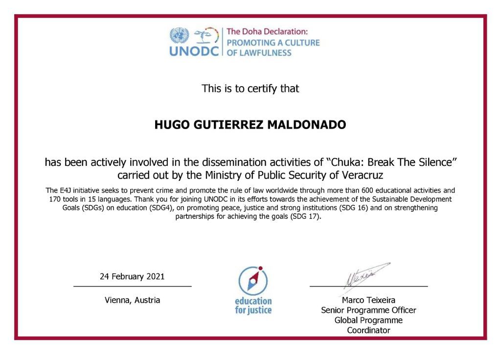 En el marco de la Iniciativa Educación para la Justicia, en alianza con la Organización de las Naciones Unidas para la Educación, la Ciencia y la Cultura (UNESCO), realizado el pasado mes de febrero, la UNODC otorgó un reconocimiento a la SSP en Viena, Austria, por desarrollar el sketch «ChuKa, Rompe el Silencio” para ayudar a las y los niños a desarrollar habilidades que combatan los diversos tipos de violencia.
