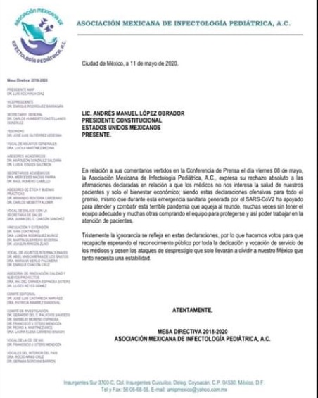 La Asociación Mexicana de Infectología Pediátrica A. C. señala «tristemente la ignorancia se refleja en estas declaraciones, por lo que hacemos votos para que recapacite».