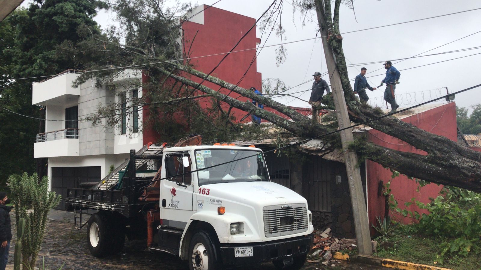 Elementos de la Dirección de Seguridad Ciudadana atienden el llamado de una persona cuyo vehículo quedó atrapado en la avenida Rébsamen y se retiran árboles caídos y ramas desgajadas en la zona de la Universidad Veracruzana (UV) y en la calle Popocatépetl de la colonia Burócratas, así la tierra producto de un deslave sobre la avenida San Cristóbal, en la Unidad Habitacional Xalapa 2000.