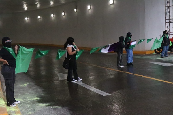 En Xalapa, un grupo de mujeres con el rostro cubierto, bloquearon el acceso el Viaducto que se ubica en el centro de esta capital, en donde también hicieron pintas con expresiones como “Aborto legal” y “Palestina, Congo y Sudán libres”.