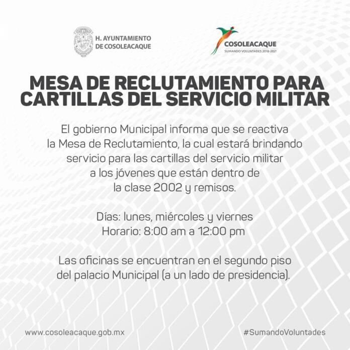 Cosoleacaque, Ver., 8 Jul-20 (VRed).- Los jóvenes de la clase 2002, remisos y anticipados, ya pueden acudir a la Mesa de Reclutamiento en el Ayuntamiento de Cosoleacaque a realizar el trámite de la cartilla de servicio militar, informó el presidente municipal Cirilo Vázquez Parissi.