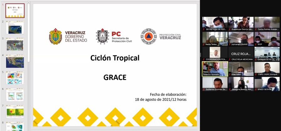 Xalapa, Ver., 18 Ago-21 (VRed).- La Secretaría de Protección Civil (PC) encabezó sesión del Comité Estatal de Emergencias con instituciones y dependencias de los tres niveles de gobierno y el sector social, ante la llegada del Huracán Grace a territorio nacional.