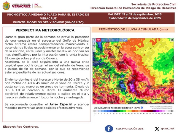 Xalapa, Ver., 15 Sept-25 (VRed).- Persisten los nublados con áreas de actividad eléctrica en la zona norte y frente a la zona costera norte y centro.