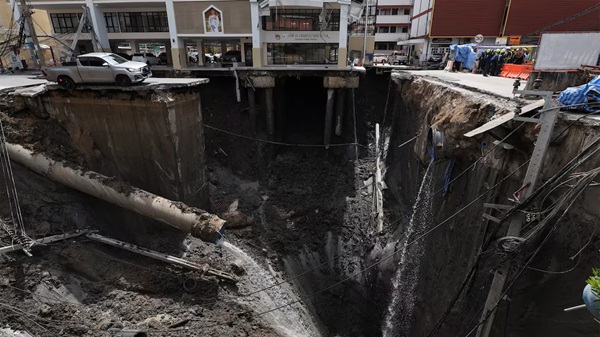 El gobernador de Bangkok, Chadchart Sittipunt, explicó que el hundimiento sucedió tras el derrumbe de un túnel ferroviario subterráneo, lo que provocó el desplazamiento súbito del terreno hacia la cavidad formada.