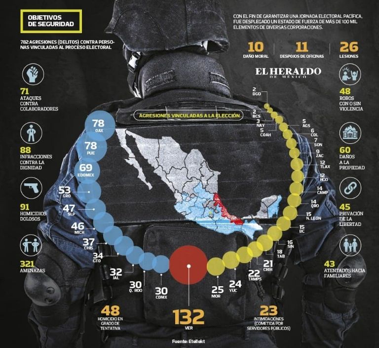 Los ataques ocurrieron en las 32 entidades del país, a lo largo de 525 municipios. Hasta antes de la jornada electoral de este domingo, fueron asesinados 91 políticos, de los cuales 22 eran aspirantes y 14 candidatos con registro.